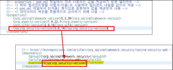 spring-security-web, spring-security-core, spring-security-config, spring-security-taglibs 라이브러리를 프로젝트에 빌드 처리 - 메이븐 : pom.xml → 4개의 라이브러리 모두 5.X.X 대 버전 사용(6.X.X대 버전은 JDK17 버전에서 사용)
