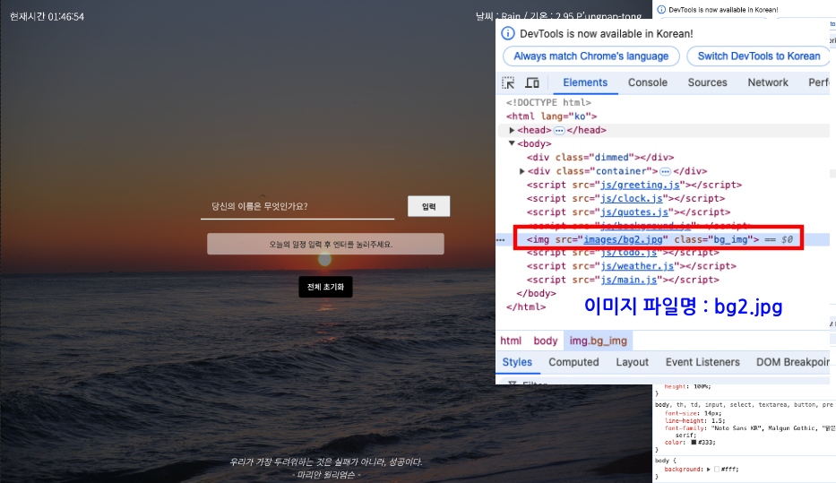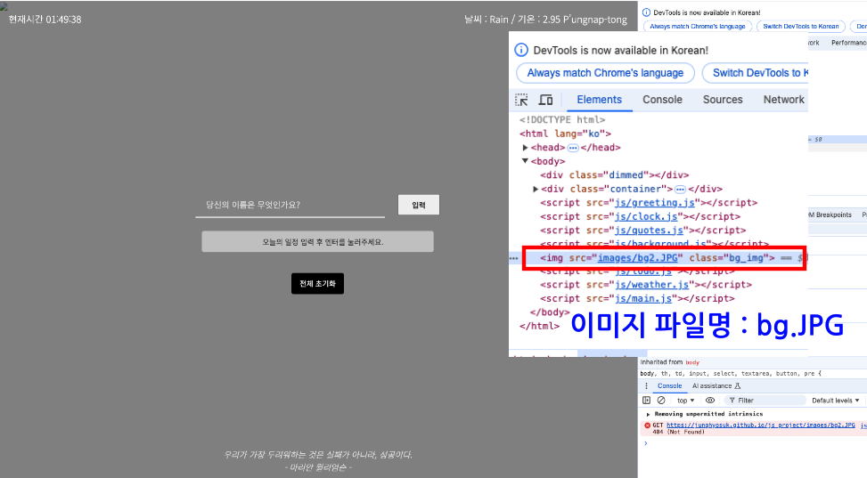 그리고 나서 개발자도구를 통해 이미지 확장자 명을 .JPG로 수정해보니까 이미지 적용이 됐다.