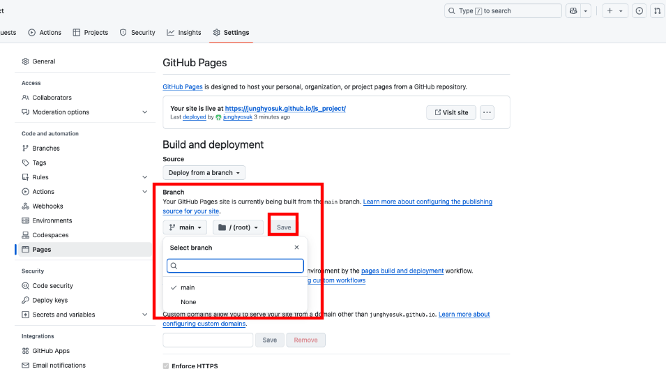 4) Branch 를 main으로 설정 후 Save 클릭(초기값은 none)